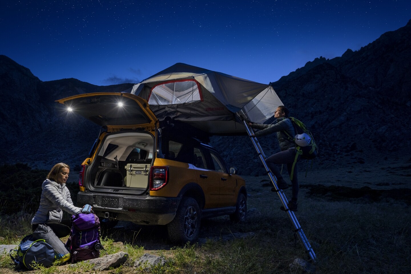 Choose from five trims with exciting names like the Base, Big Bend, Outer Banks, the rough-and-ready Badlands, and the limited First Edition. The boxy stance helps to give the SUV an athletic look, while the front grille and round headlights help to give the Sport iconic Bronco styling. The safari-style roof on all the trims adds extra headroom, and the steel roof can hold up to 150 pounds, perfect for carrying multiple adventure toys or a rooftop tent.