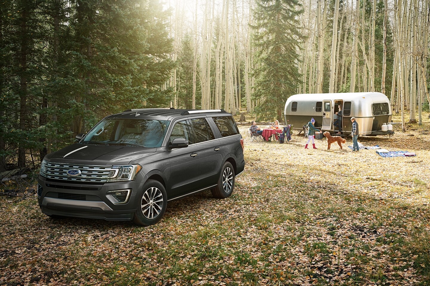 The 2021 Ford Expedition Max is available in four trim levels: XLT, Limited, King Ranch, and Platinum. The roof rack, side rails, and running boards give the SUV a sporty look, while the optional roof-rail crossbars and stone gray mirror caps and aggressive touches. The King Ranch stands out with its unique badging.