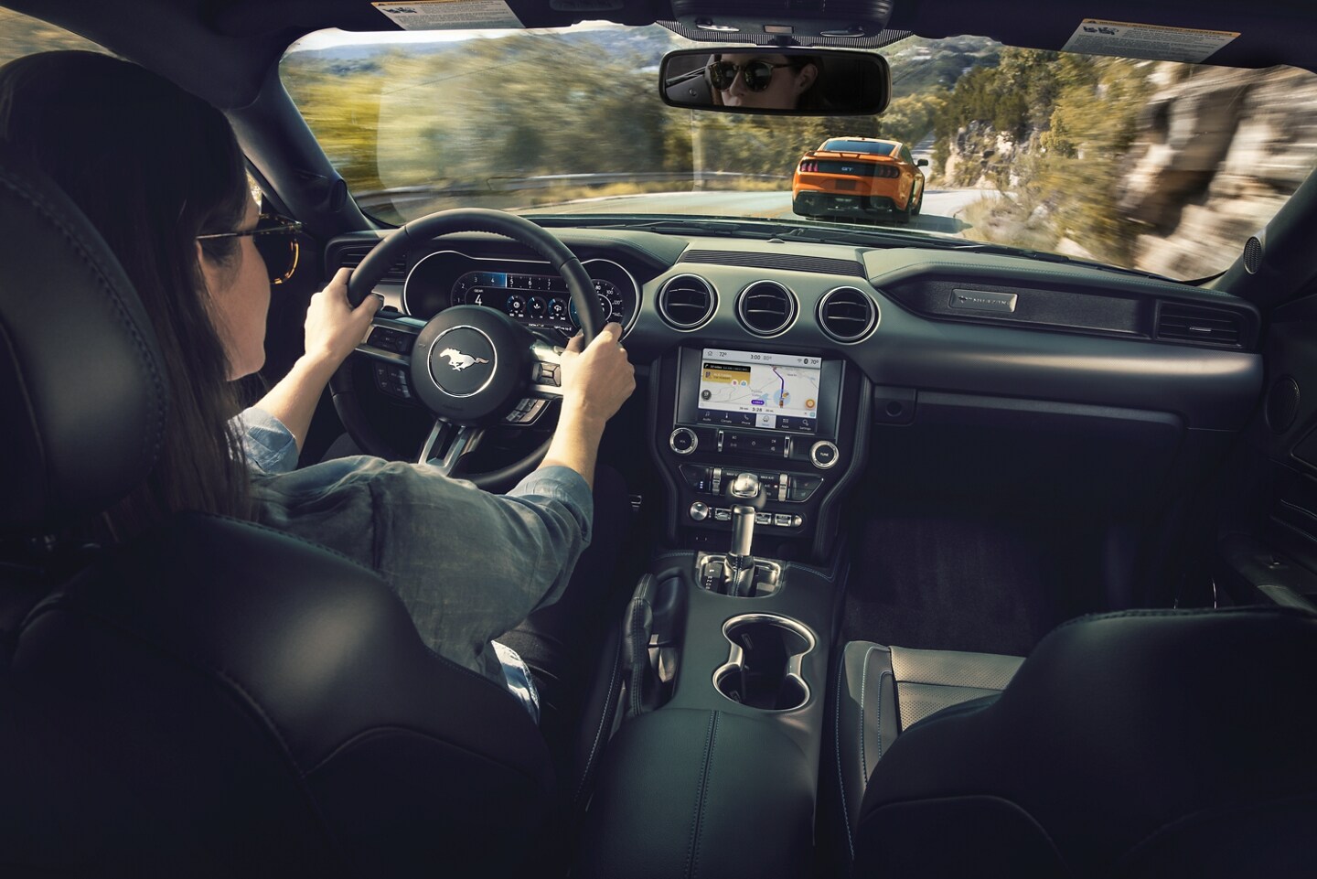 The interior of the 2021 Ford Mustang is just as impressive as what is under its hood. It comes with entertainment features like FordPass Connect internet access, a 12-speaker B&O premium sound system, a 1000-watt premium amplifier, steering wheel mounted audio controls, a pair of first-row LCD monitors, the SYNC infotainment system, and a CD-MP3 decoder. Convenience features on the 2021 Ford Mustang include one-touch-down power windows, seats with memory settings, a retained accessory power system, two USB ports, two 12-volt DC power outlets, a voice-activated GPS navigation system, automatic dual-zone air conditioning, and cruise control with steering wheel controls.